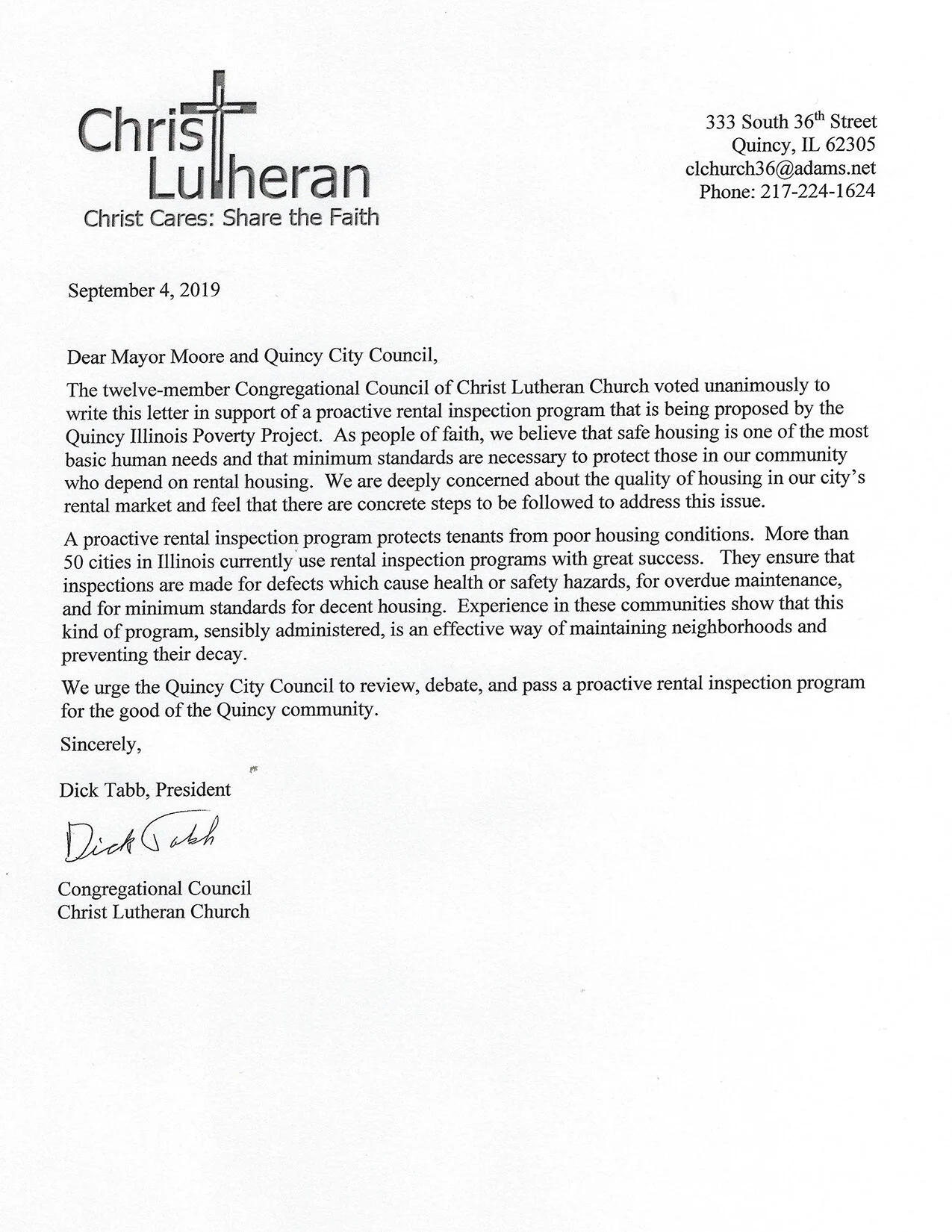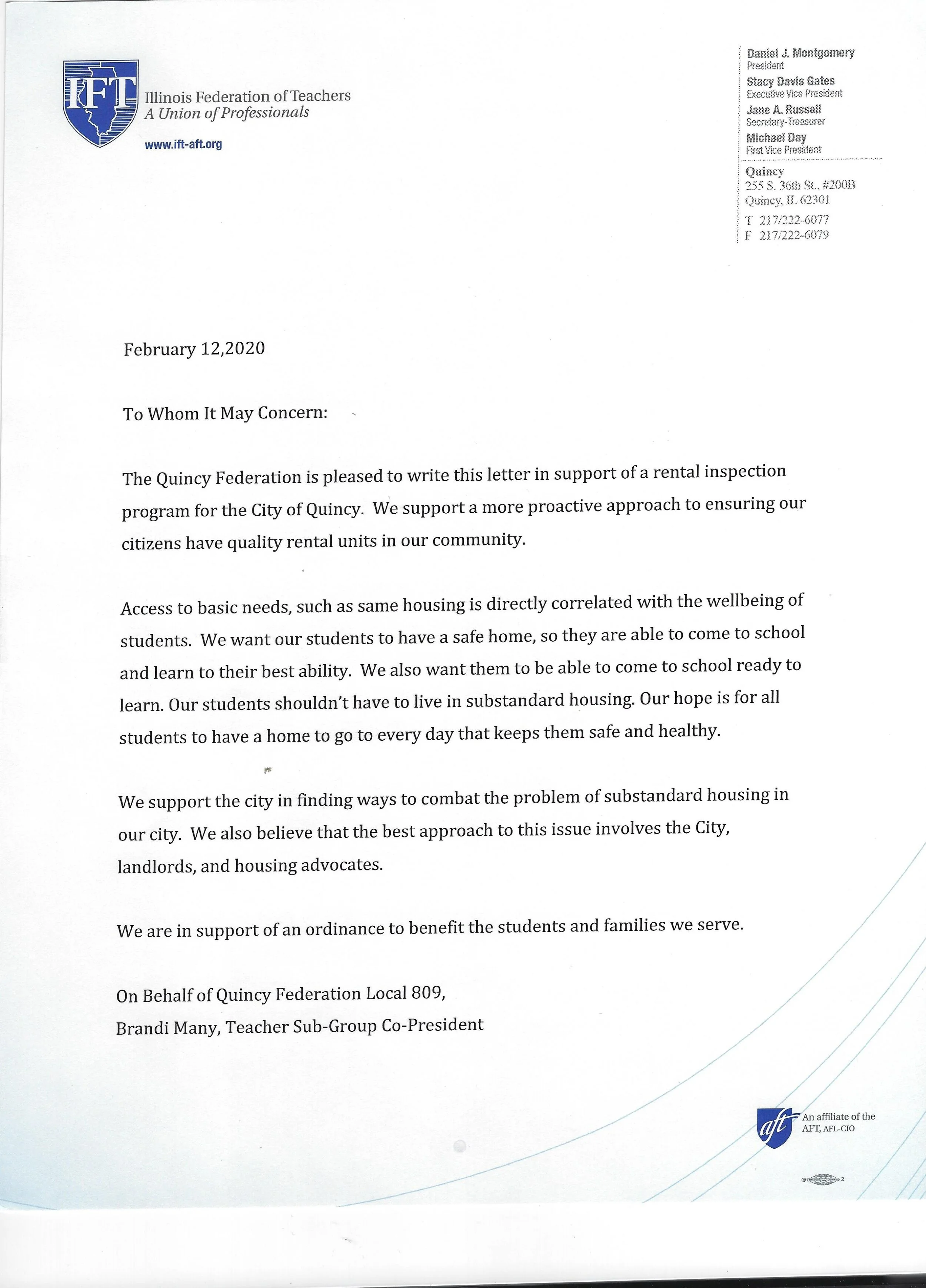 THIS IS A GROWING LIST OF IMPORTANT LOCAL SOCIAL SERVICE AGENCIES, CHURCHES, THE QUINCY SCHOOL DISTRICT, CIVIC ORGANIZATIONS, AND INDIVIDUALS COMMITTED TO FAIR AND SAFE HOUSING FOR ALL QUINCY RESIDENTS. EACH EXPRESSES THEIR SUPPORT FOR A PROACTIVE RENTAL OCCUPANCY INSPECTION PROGRAM TO ACHIEVE THESE GOALS. PLEASE READ THE CONTENT OF THESE POWERFUL LETTERS. THANK YOU.